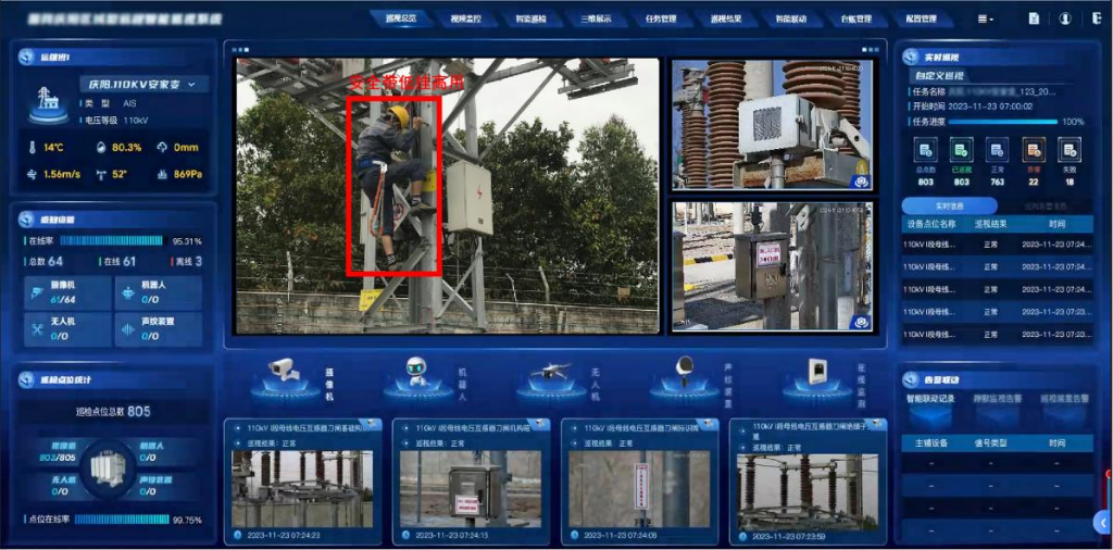 目前,公司已在内蒙古、甘肃、河北、河南、新疆、安徽、重庆等多地的变电站部署使用变电站巡检系统,其中包含多套超高压、特高压变电站智能巡检系统。在某1000KV特高压变电站中,一号娱乐电子利用自主研发的人工智能、数字孪生、无人机自动巡航等新技术,以及高清视频、机器人、在线监测等多种巡视装置立体式覆盖,完成全站十七类设备,九千多个巡检点位的智能巡视任务,实现全站设备的全景孪生展示、在线监测、主动预警、应急指挥和智能化决策支持,典型算法识别率达90%以上,为全面实现变电站高可靠自主可控,打造“集控站+无人值守变电站+设备主人制”变电运维新模式提供坚实的技术保障。